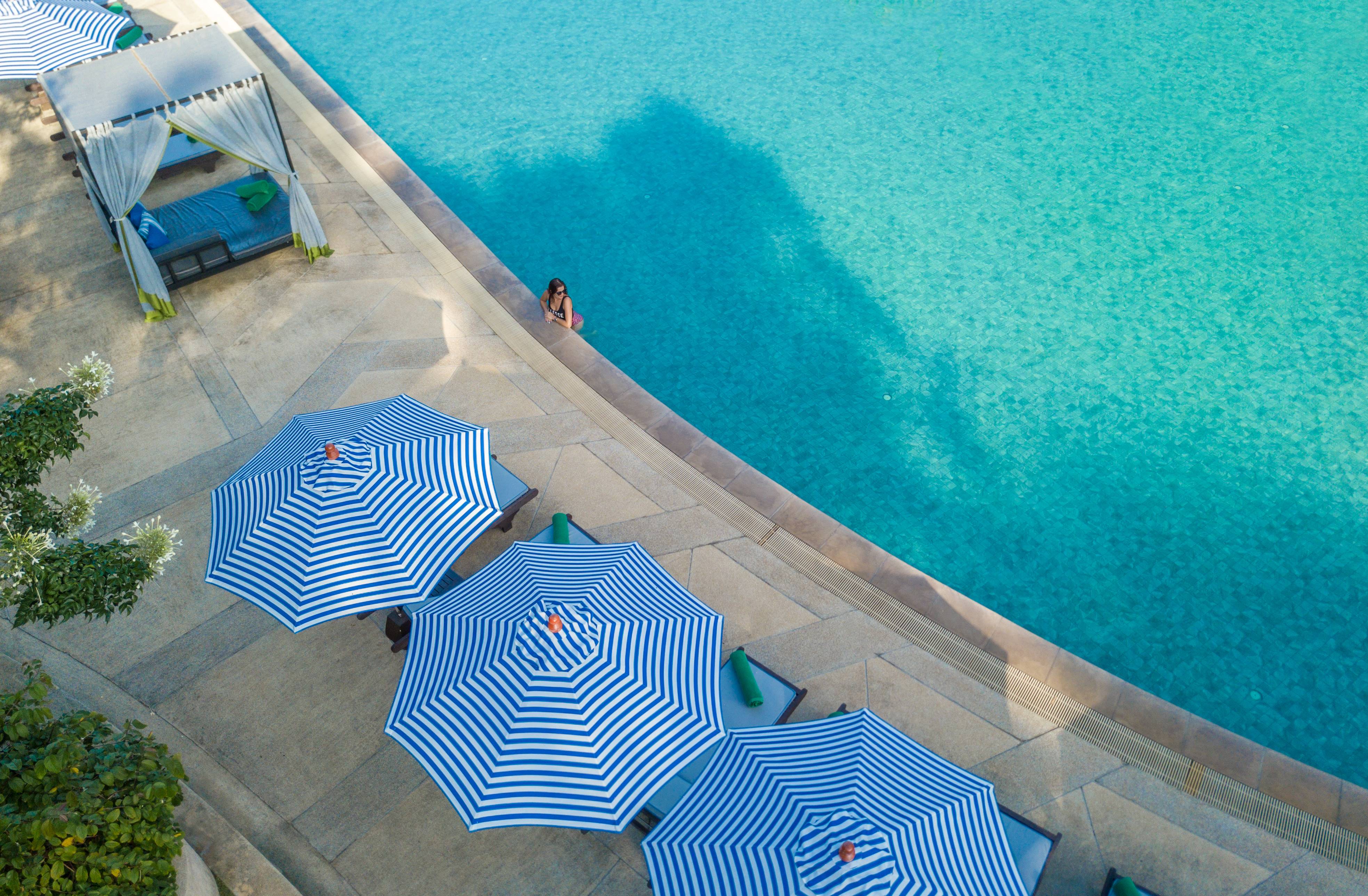 → Большой открытый бассейн с зоной отдыха и видом на тропические сады.